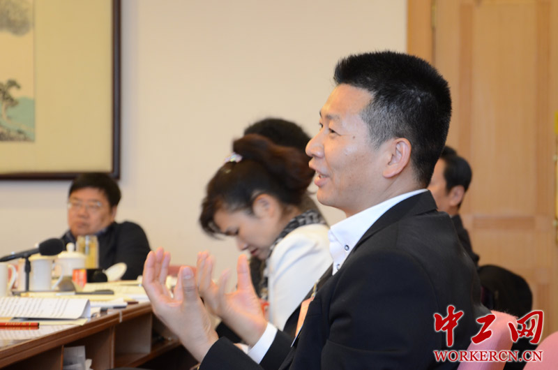 2014年3月5日,全国政协委员、2010年全国劳动模范、美特斯·邦威总裁周成建在工会界别小组讨论会上发言。 (中工网记者 笑语摄)