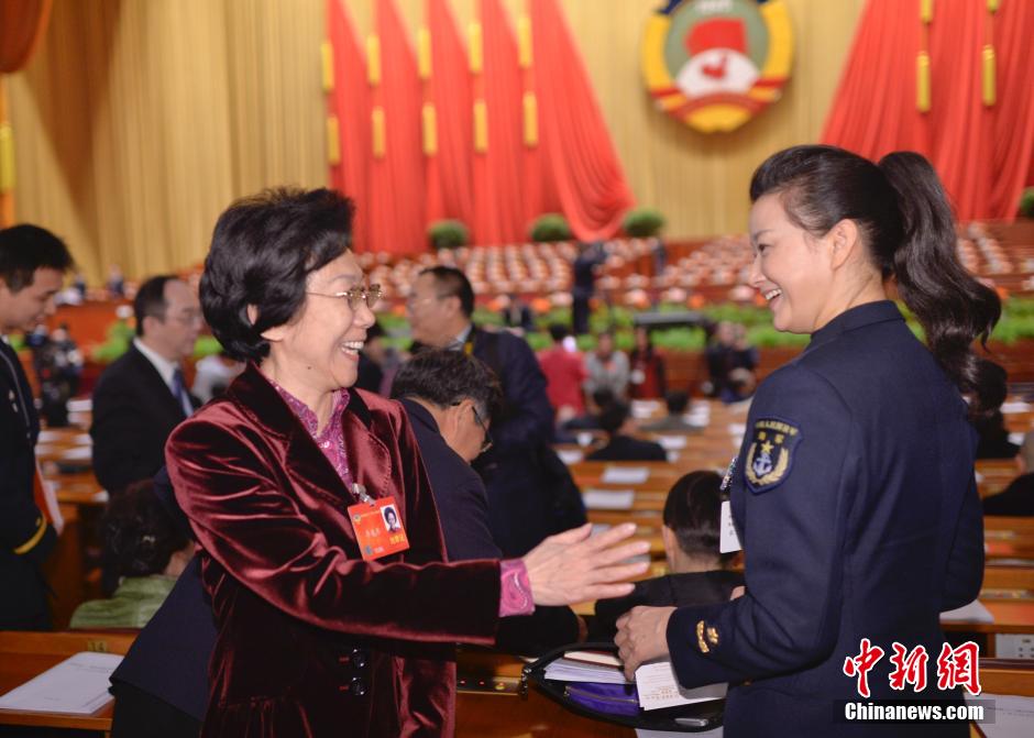 3月9日,全国政协十二届二次会议在人民大会堂举行全体会议。会前,李东东委员与宋祖英委员交谈。中新社发 廖攀 摄