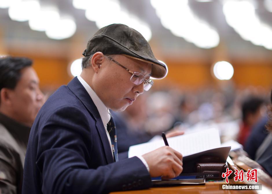 3月9日,全国政协十二届二次会议在人民大会堂举行全体会议。陈贵云委员边听边记。中新社发 廖攀 摄
