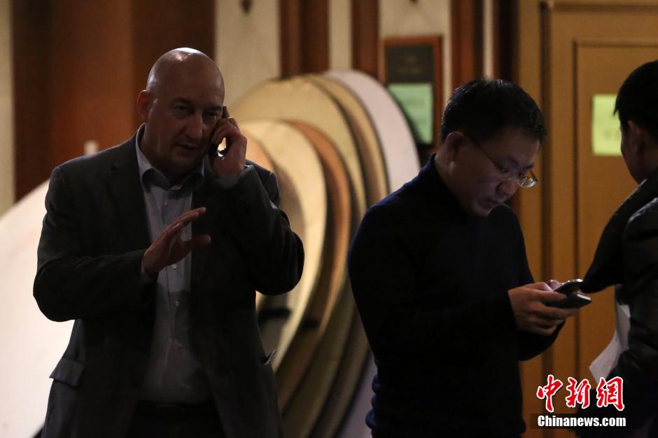 3月9日,马来西亚航空公司中国区总经理和商务总裁在处理失联航班旅客家属问题。中新社发 韩海丹 摄