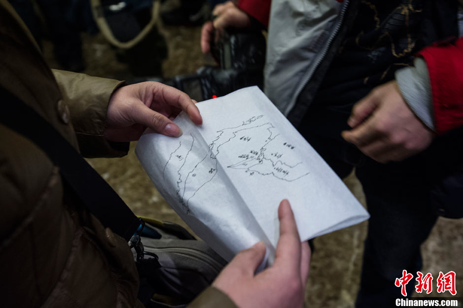 3月9日,失联超过30小时的马航MH370航班的乘客亲属继续在北京丽都饭店等待马航的官方消息,不时有亲属进出在该饭店雨轩厅临时设立的马航协调区,众多媒体记者则未被允许进入厅内,只得在门外守候。图为一名航班乘客的亲友手中拿着的失联航班可能坠海区域的手绘图。中新社发 崔楠 摄