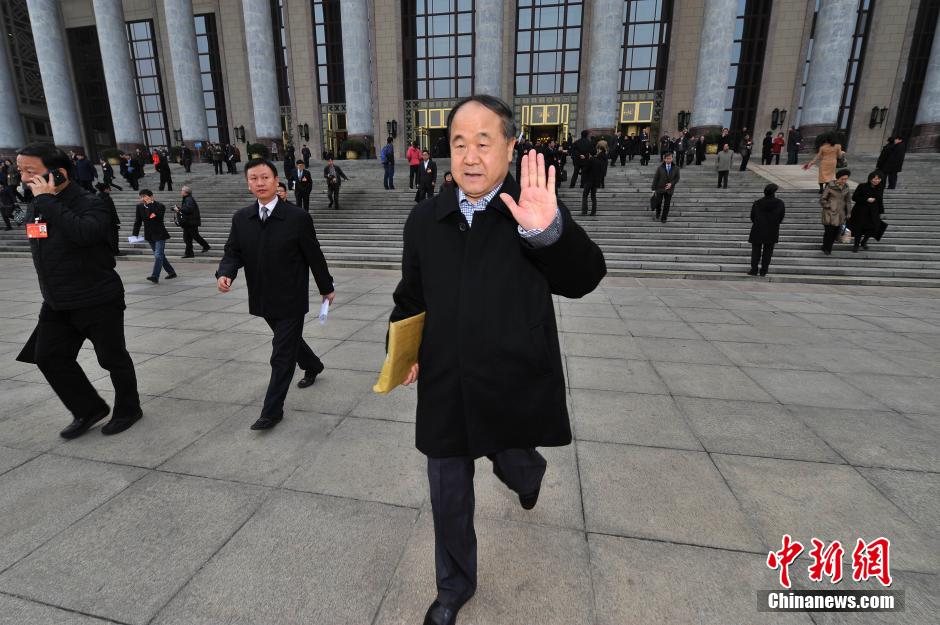 3月9日,全国政协十二届二次会议在北京人民大会堂举行第四次全体会议。莫言委员走出会场向记者挥手致意。中新社发 骆云飞 摄