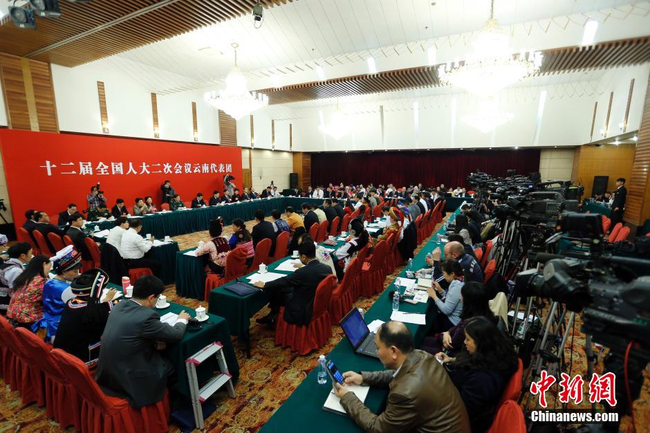 3月9日,十二届全国人大二次会议云南代表团全体会议向媒体开放并回答记者提问。中新社发 盛佳鹏 摄