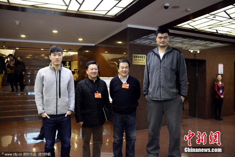 3月9日,北京,全国政协十二届二次会议文艺界别委员小组讨论会。黄宏、郁钧剑在电梯口偶遇姚明、刘翔,邀请他们合影留念。 图片来源:CFP视觉中国