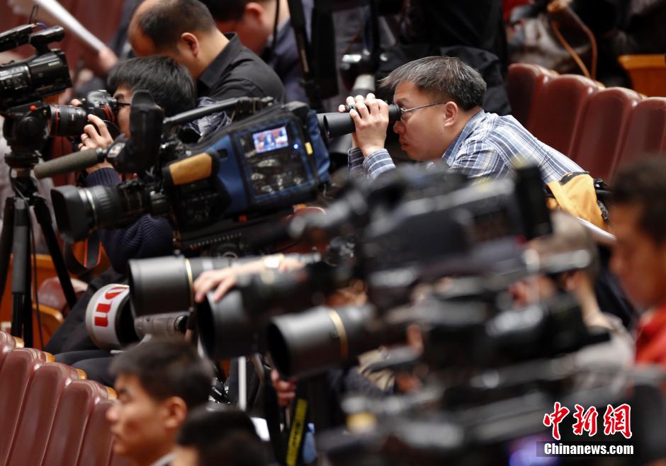 3月9日上午9时,第十二届全国人民代表大会第二次会议在人民大会堂举行第二次全体会议,听取全国人大常委会委员长张德江作全国人大常委会工作报告。记者席上的记者用望远镜观察会场。中新社发 盛佳鹏 摄