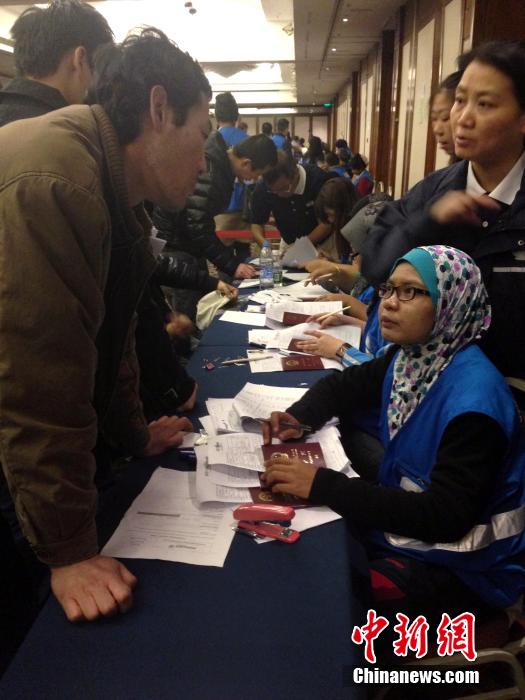 3月10日中午,台湾慈济基金会的志愿者在北京丽都饭店为马航失联航班乘客家属提供签证材料收集服务。中新社发 富田 摄