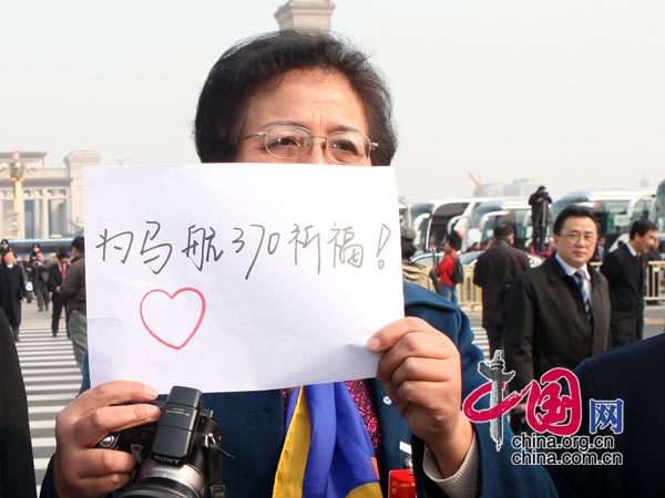 3月10日下午3时,十二届全国人大第二次会议在人民大会堂举行第三次全体会议,听取最高人民法院院长周强作最高人民法院工作报告;听取最高人民检察院检察长曹建明作最高人民检察院工作报告。图为代表共同为MH370航班祈福。董宁 摄 图片来源:中国网