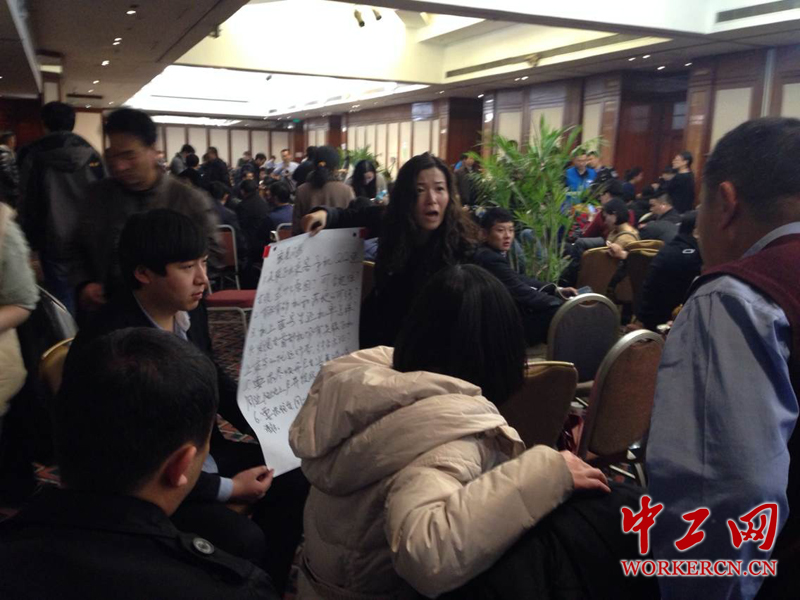 一名乘客家属在白板上写出向马航代表提出的疑问。 中工网记者宋晓俐摄