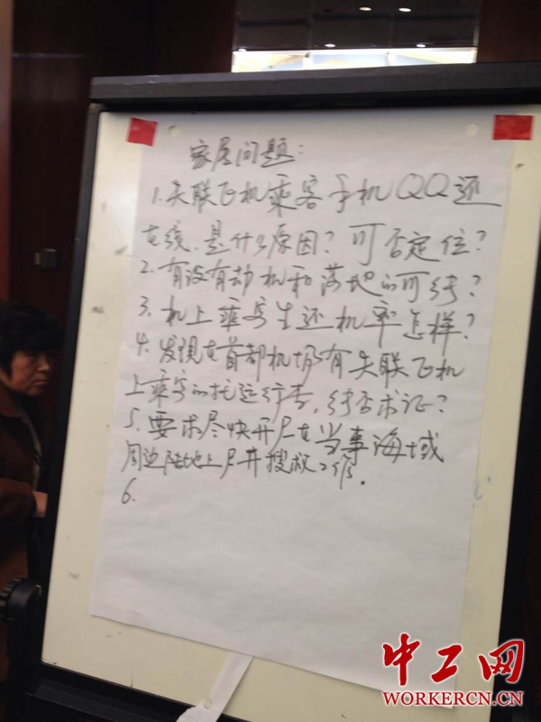 一名乘客家属在白板上写出向马航代表提出的疑问。    中工网记者宋晓俐摄