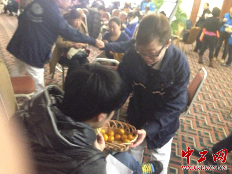 3月10下午16:30分。马航失联事件发生后的第62小时,设在北京丽都饭店的新闻发布会现场和家属联络区里,数百名家属碰就在焦急的等待着消息,为了给家属们提供更好的服务,现场工作细心地人员为家属们提供了水和食物。中工网记者 宋晓俐 摄