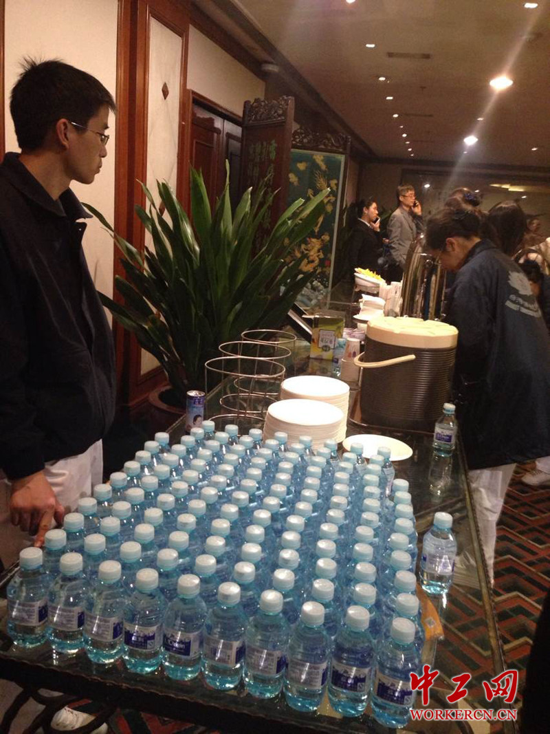 3月10下午16:30分。马航失联事件发生后的第62小时,设在北京丽都饭店的新闻发布会现场和家属联络区里,数百名家属碰就在焦急的等待着消息,为了给家属们提供更好的服务,现场工作细心地人员为家属们提供了水和食物。中工网记者 宋晓俐 摄