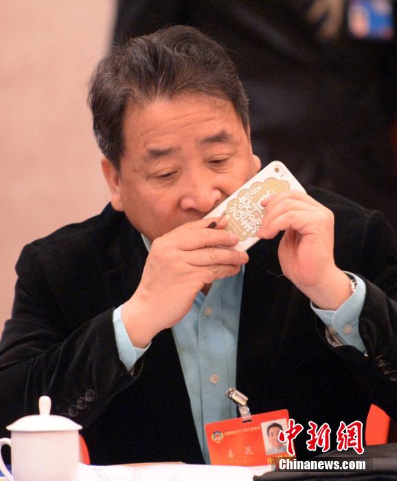 3月11日,北京,2014年全国两会在北京召开。当日全国政协十二届二次会议文艺界别委员小组讨论会在北京国际饭店举行。图为姜昆玩弄手机。爱国者 摄 图片来源:东方IC