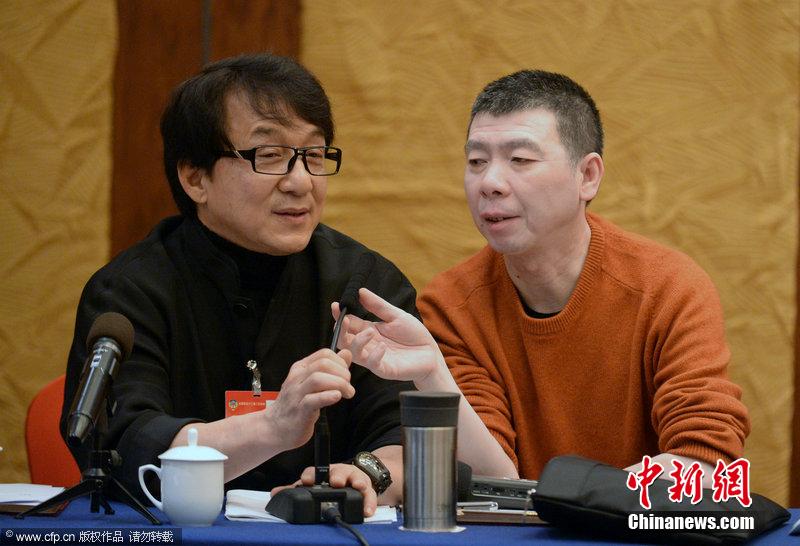 3月11日,全国政协十二届二次会议小组讨论会继续进行,在文艺界别小组讨论会上,政协委员们发言踊跃,讨论气氛热烈。图为成龙大谈环保。守义人 摄 图片来源:CFP视觉中国