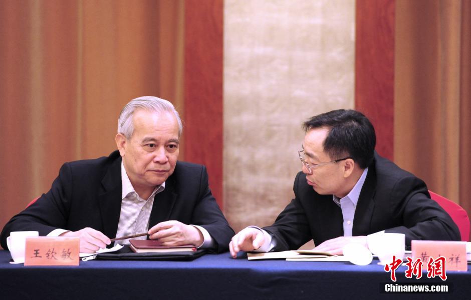 3月11日,全国政协十二届二次会议举行小组会议,审议各项决议草案、讨论最高人民法院工作报告和最高人民检察院工作报告。全国政协委员、全国工商联主席王钦敏(左)与全国政协委员、全国工商联专职副主席黄小祥交谈。中新社发 杨华峰 摄