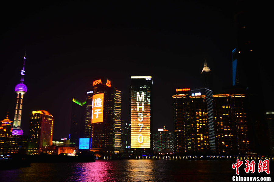 3月11日,上海,浦东陆家嘴金融区一高楼墙体巨屏打出了“MH370 我们等你回家”的字样,为失联同胞祈福。沈春琛 摄 图片来源:CFP视觉中国