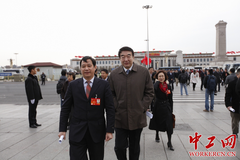 3月12日,全国政协十二届二次会议闭幕会在北京人民大会堂召开。图为大会开始前工会界别政协委员董秀彬(右)、邹先荣(左)步入会场。中工网记者 韩靖摄