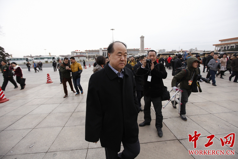 3月12日,全国政协十二届二次会议闭幕会在北京人民大会堂召开。图为全国政协委员莫言步入会场。中工网记者 韩靖摄