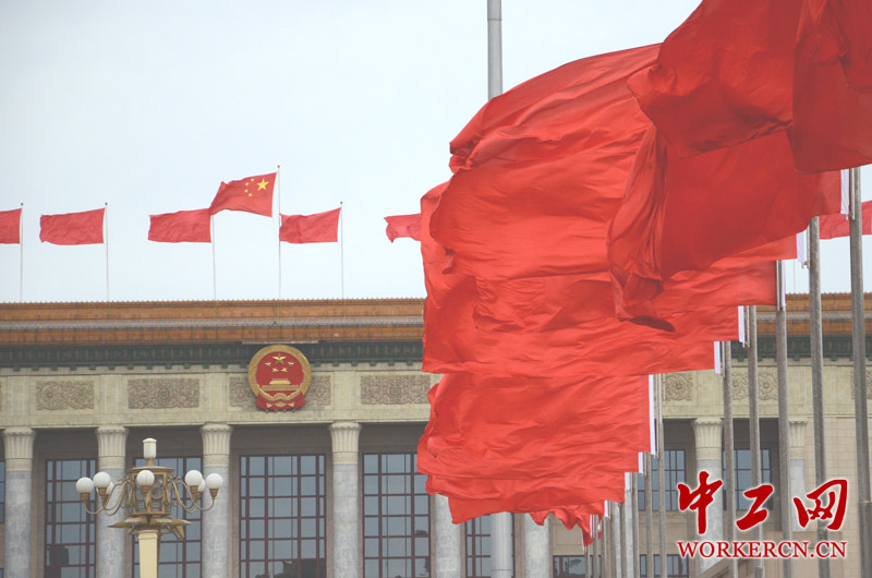 2014年3月12日,全国政协第十二届二次会议在北京人民大会堂举行闭幕会。今天北京为多云天气,空气质量为优,晨间气温在6℃左右,有北风3—4级,使人的体感温度只有2℃。上会记者为应对“春寒”天气纷纷换上了冬装,帽子、围巾、手套齐上阵。图为天安门广场上红旗被吹得猎猎作响。 (中工网记者 笑语摄)
