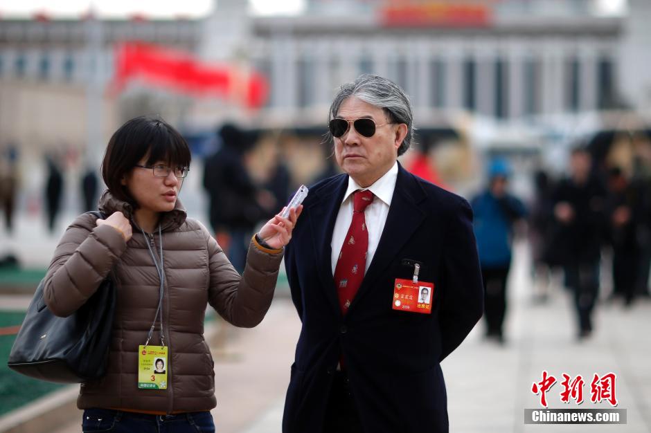 3月12日,全国政协十二届二次会议在北京人民大会堂举行闭幕会。参加闭幕会的全国政协委员霍震霆在广场接受记者采访。中新社发 盛佳鹏 摄