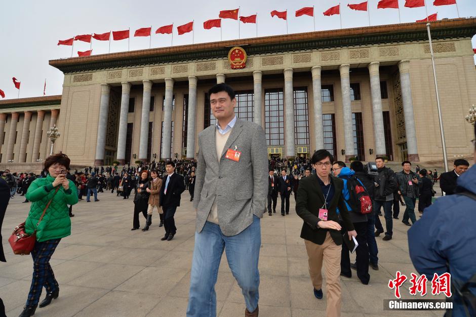 3月12日,全国政协十二届二次会议完成各项议程在北京人民大会堂闭幕。姚明委员步出会场。中新社发 骆云飞 摄