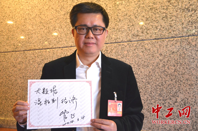 全国政协委员管飞在接受采访时写下自己的2014年上会关键词:大数据、混合所有制经济。全国政协委员管飞的提案的重点是将大数据上升为国家战略。他提到2012年美国已经率先将大数据上升为国家战略,他认为在信息化爆炸的时代,中国大数据产业应该走在世界前面。 (中工网记者 笑语摄)