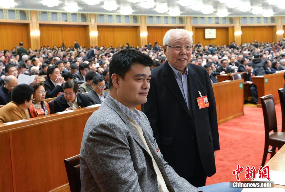 3月12日,全国政协十二届二次会议在北京人民大会堂举行闭幕会。95岁的李辅仁委员与姚明委员合影留念。中新社发 刘震 摄