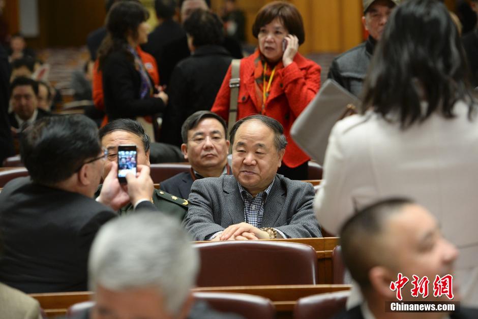 3月12日,全国政协十二届二次会议在北京人民大会堂举行闭幕会。闭幕大会开始前,参会委员纷纷与莫言委员合影留念。中新社发 刘震 摄