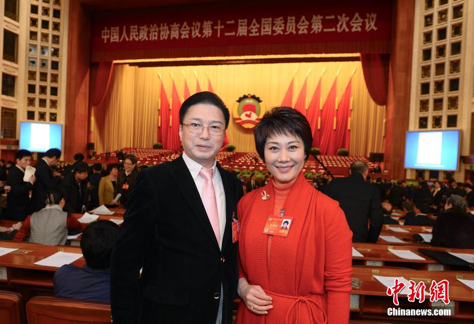 3月12日,全国政协十二届二次会议在北京人民大会堂举行闭幕会。闭幕大会开始前,谭孝曾委员(左)与董圆圆委员合影。中新社发 刘震 摄