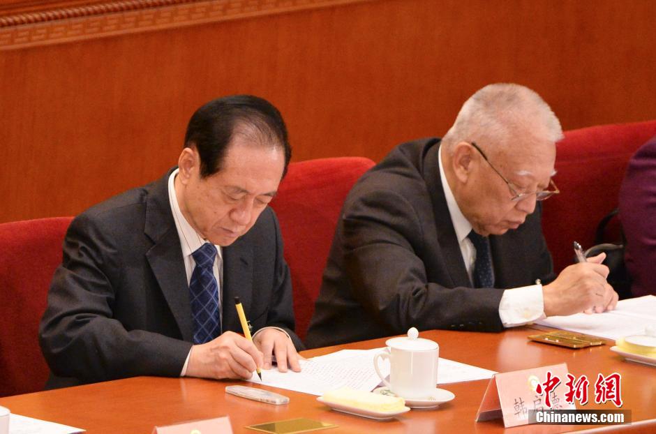 3月12日,全国政协十二届二次会议在北京人民大会堂举行闭幕会,韩启德用毛笔做笔记。中新社发 廖攀 摄