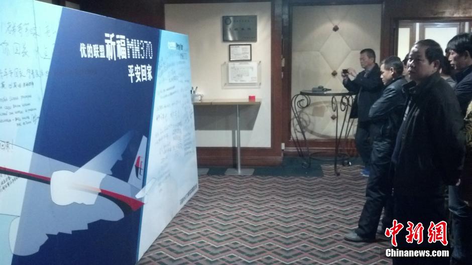 3月20日,北京丽都饭店家属区的马航失联航班祈福墙,众多乘客亲友在墙上留言祈祷家人朋友平安归来。中新社发 崔楠 摄