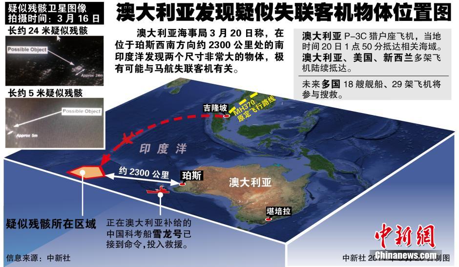 澳大利亚海事局3月20日称,在位于珀斯西南方向约2300公里处的南印度洋发现两个尺寸非常大的物体,极有可能与马航失联客机有关。中新社发 董美 制