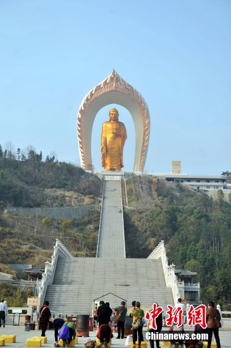 3月21日下午,民众来到位于江西星子县境内的48米世界最高阿弥陀佛铜像东林大佛前祈福。当日是中国农历春分节气,尚未全部完工的世界最高阿弥陀佛铜像东林大佛整体工程吸引了来自各地的信众、游客前来祈愿。刘占昆 摄