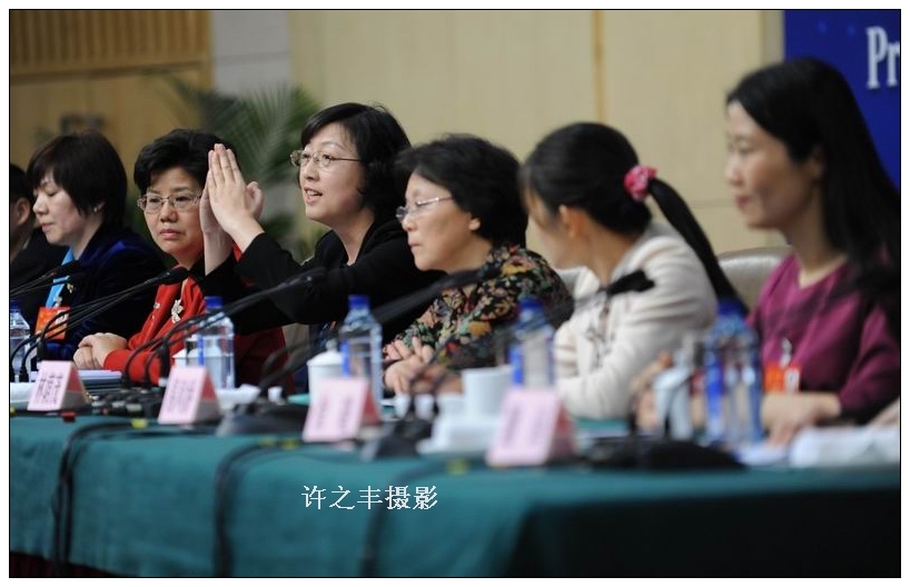 2014年3月12日下午,第十二届全国人大二次会议梅地亚新闻中心发布厅,6位女代表就“社会文明进程中的女性发展和权益保护”的相关问题回答中外记者的提问。山东省威海市委副书记、市长张惠谈中国妇女的地位。工人日报-中工网记者许之丰摄影