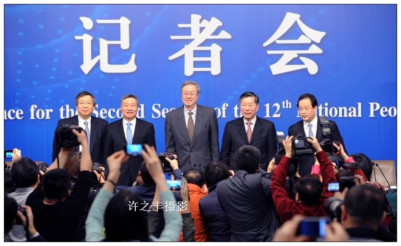 2014年3月11日上午,梅地亚中心发布厅中国人民银行行长周小川等五位嘉宾就“金融改革与发展”的相关问题回答中外记者的提问。中国人民银行行长周小川、中国银行业监督管理委员会主席尚福林、中国证券监督管理委员会主席肖钢、中国保险监督管理委员会主席项俊波、中国人民银行副行长、国家外汇管理局局长易纲。图为行长们在记者面前亮相。工人日报-中工网记者许之丰摄影