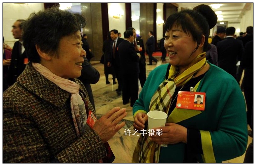 2014年3月10日下午,进城打工近20余年的农民工、全国人大代表陈雪萍(图右)在人民大会堂说,农民进城务工,尤其是建筑工地上,最怕的也是最愁的就是“恶意欠薪”,“干一年要拿不回来工钱,家里老人、孩子吃什么?”工人日报-中工网记者许之丰摄影