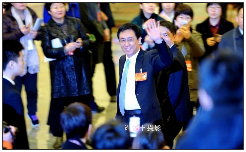 2014年3月5日,第十二届全国人民代表大会第二次会议在北京人民大会堂开幕。人民大会堂北门内是部长出入会场通道,全国政协委员也通过此通道,广州恒大主席许家印参加政协会议,许老板低调现身,挥挥手面对记者们,据了解,他今年两会带来“要加快青少年足球人才培养”提案。工人日报-中工网记者许之丰摄影