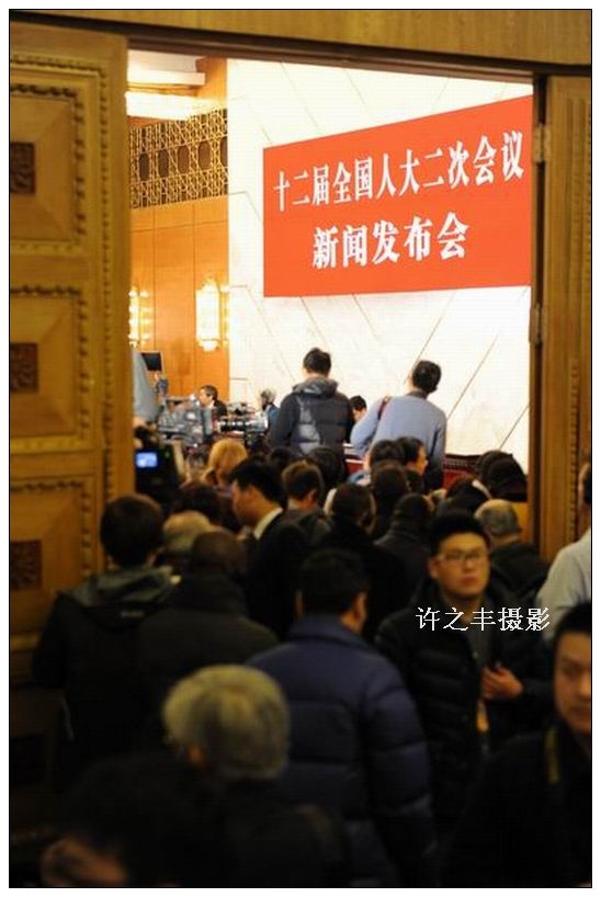 2014年3月4日上午11时,第十二届全国人民代表大会第二次会议举行首次新闻发布会,大会发言人就大会议程和人大工作相关的问题回答中外记者的提问。新闻发布会大厅记者已经爆满,许多记者只能站在门外旁听。工人日报-中工网记者许之丰摄影