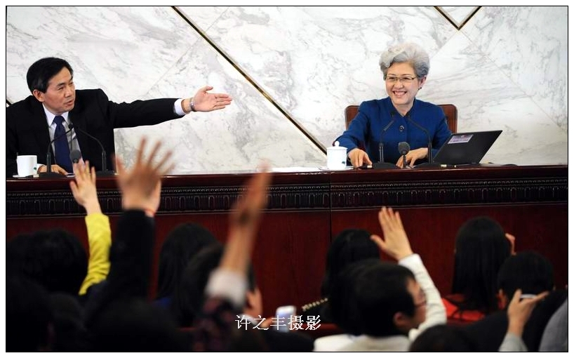 2014年3月4日上午11时,第十二届全国人民代表大会第二次会议举行首次新闻发布会,大会发言人就大会议程和人大工作相关的问题回答中外记者的提问。新闻发布会大厅记者已经爆满,许多记者只能站在门外旁听。图为风度翩翩的女新闻发言人傅莹深受记者们的欢迎。工人日报-中工网记者许之丰摄影