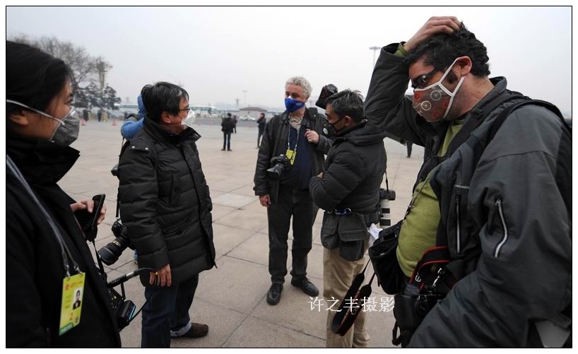 2014年3月3日下午,北京城被雾霾天气笼罩,在北京天安门广场,参加全国政协十二届二次会议开幕式的工作人员和个别委员戴上口罩,成为今年两会第一天新景。工人日报-中工网记者许之丰摄影