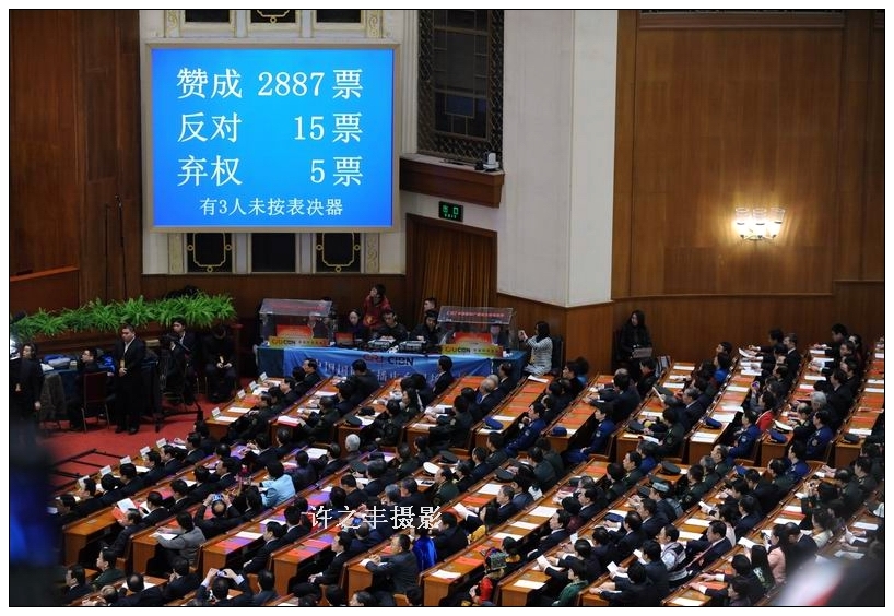 2014年3月13日上午,第十二届全国人大二次会议在人民大会堂闭幕式上,《政府工作报告》的票数。工人日报-中工网记者许之丰摄影
