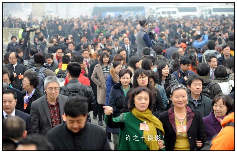 2014年3月3日下午,全国政协十二届二次会议在北京人民大会堂开幕。会议开始之前委员们步入会场,记者们争相采访拍摄全国政协委员。工人日报-中工网记者许之丰摄影