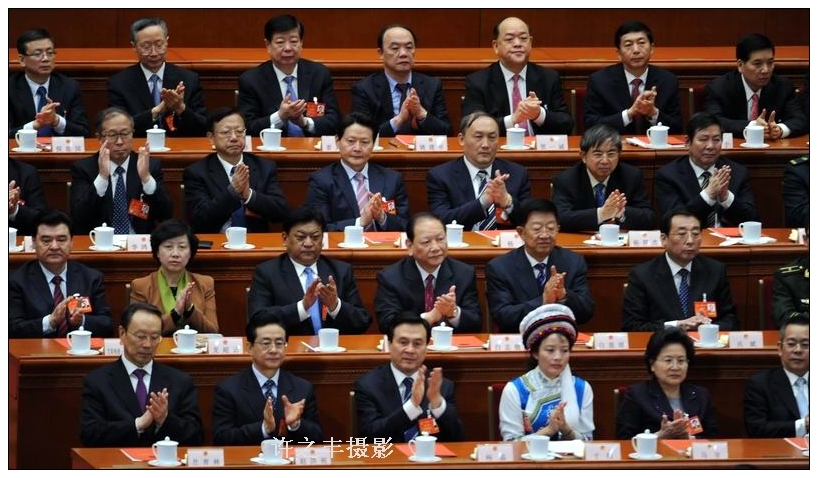 2014年3月13日上午,第十二届全国人大二次会议在人民大会堂闭幕式上,《政府工作报告》的票数。主席台上的代表鼓掌。工人日报-中工网记者许之丰摄影