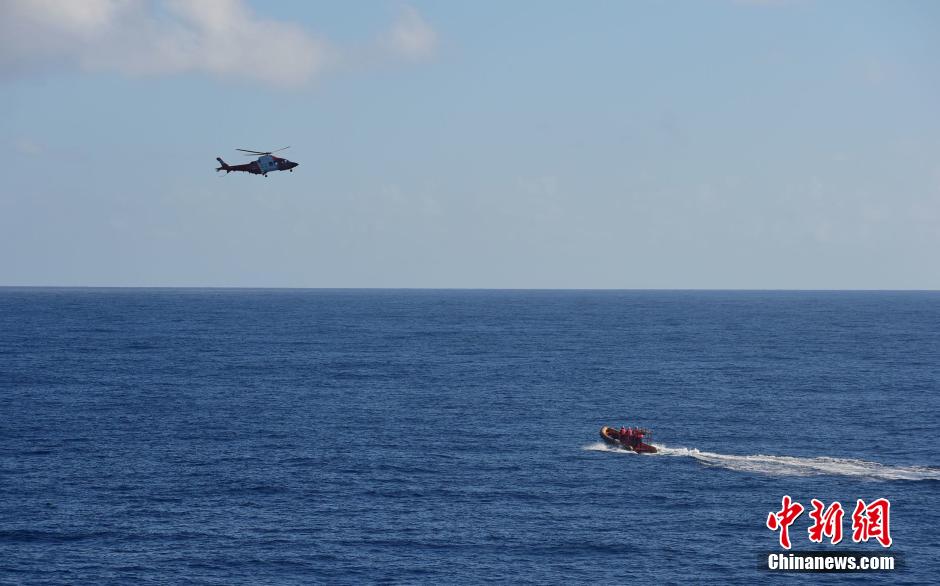 图为“海巡01”轮船载直升机与救生艇进行配合,进行海空立体搜寻。