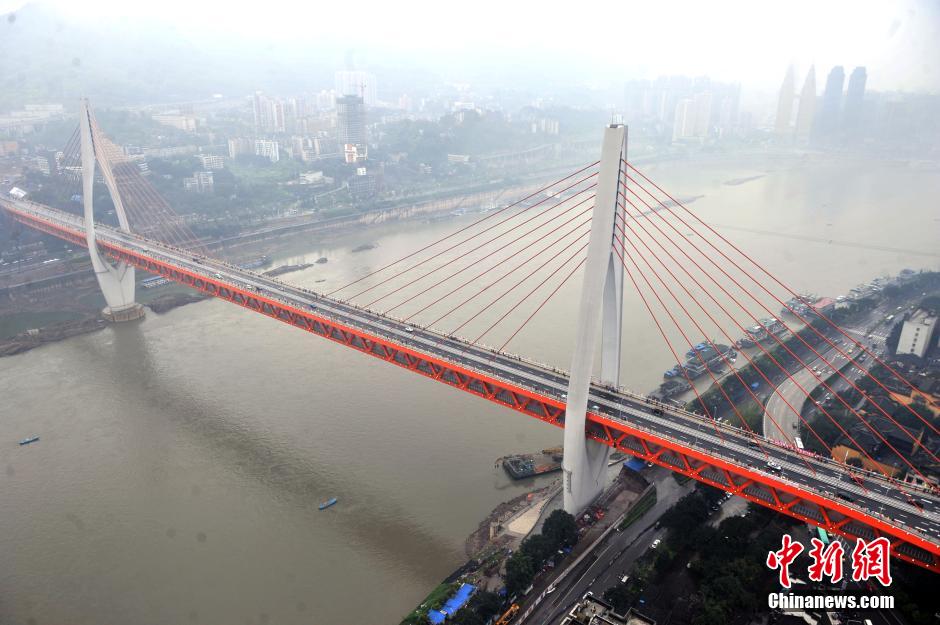 3月31日,重庆新地标建筑——两江大桥中的东水门长江大桥正式通车。该桥为世界首次采用索锚梁固结构的大桥,索塔锚吨位、斜拉索吨位均为世界之最,主桥塔下大吨位支座系世界首次采用“牛腿”支撑方式,该大桥修建刷新了多项中国桥梁纪录。据悉,东水门长江大桥为双塔单索面部分斜拉梁桥,主塔基础工程于2009年12月29日开工,全长1124.947米,桥身为三跨布局,主跨445米,同类桥型跨径世界第一,桥面总宽24米。大桥采用双主塔设计,塔柱为圆润的天梭造型,其中南塔总高172.61米,北塔总高162.49米,大桥上下双层布设桥面,上层桥面为双向四车道汽车交通,下层桥面为双线轨道交通。陈超 摄
