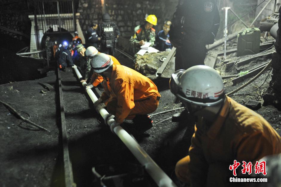4月7日,云南曲靖煤矿透水事故现场,500多人正在云南曲靖下海子媒矿展开救援,使用5台大功率抽水泵连夜抽水。目前,井下22名矿工仍然被困。中新社发 任东 摄
