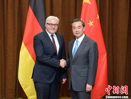 4月14日,中国外交部部长王毅(右)在北京与来访的德意志联邦共和国外交部长施泰因迈尔举行会谈。中新社发 侯宇 摄