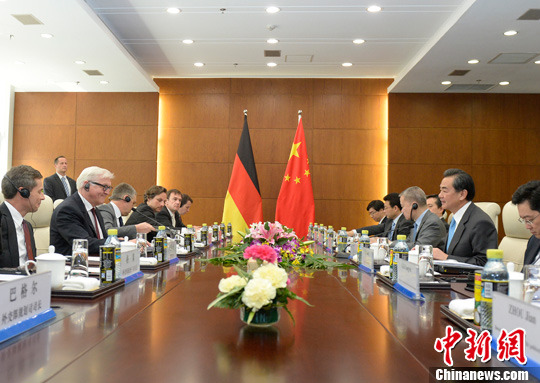 4月14日,中国外交部部长王毅(右二)在北京与来访的德意志联邦共和国外交部长施泰因迈尔(左二)举行会谈。中新社发 侯宇 摄