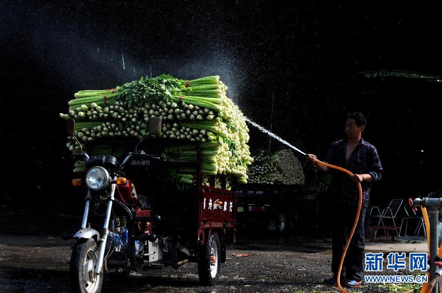 4月14日,河南中牟县大孟镇一位农民给准备外运的芹菜浇水保鲜。