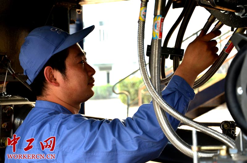 图为张如意在认真检查机车底部的每一根线缆。 (中工网记者 笑语摄)