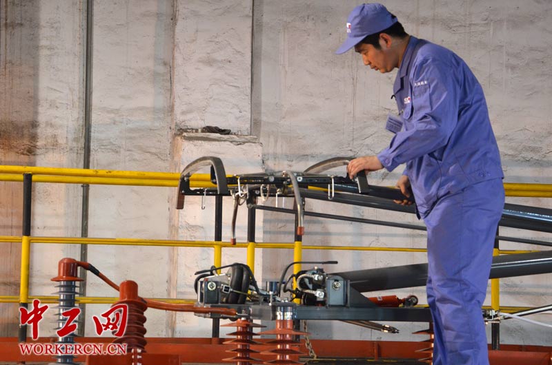图为张如意在机车顶部检查。 (中工网记者 笑语摄)